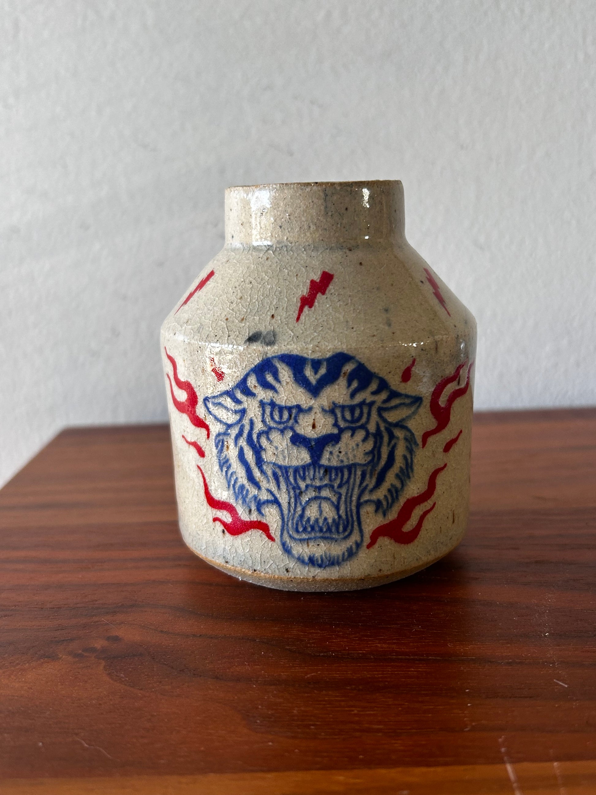 Hand thrown hand painted little traditional tattoo tiger bud vase.